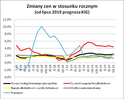 Oczekujemy, że w najbliższych miesiącach roczny wskaźnik inflacji może nieznacznie obniżyć się w stosunku do zanotowanego w czerwcu – z minimum lokalnym na poziomie 2,3% w początku kwartału czwartego. Zakładamy, że w grudniu br. dwunastomiesięczny wskaźnik inflacji wynosić będzie 2,4%, średnioroczny zaś poziom wzrostu cen w roku 2019 wyniesie 2,1%, wobec 1,7% w roku 2018.
