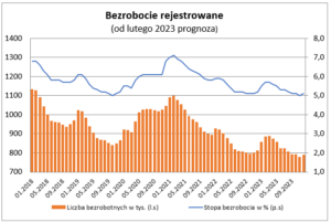 Zima przynosi sezonowe pogorszenie na rynku pracy. Lokalne maksimum oczekiwane jest w lutym ze stopą bezrobocia na poziomie 5,7% oraz liczbą osób w rejestrach bezrobotnych rzędu 890 tys. Wiosną i latem sytuacja na rynku pracy będzie się sezonowo poprawiać, lecz słabiej niż zazwyczaj. W konsekwencji czasowo liczba bezrobotnych i stopa bezrobocia mogą okazać się nieco wyższe niż przed dwunastoma miesiącami. Oczekujemy, że w końcu roku 2023 wynosić będzie 5,1% przy liczbie bezrobotnych sięgającej 800 tys. osób.