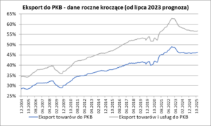 Saldo obrotów bieżących w ujęciu rocznym kroczącym po czerwcu okazało się dodatnie i wyniosło 997 mln EUR, co stanowiło odpowiednik 0,14% PKB Polski. Po maju saldo obrotów bieżących było ujemne i wyniosło -1 707 mln EUR, tj. -0,26% PKB Polski. Widać więc w tym zakresie znaczącą (i kolejną z rzędu) poprawę. Jeszcze w październiku 2022 ujemne saldo wyniosło -22 573 mln EUR co było odpowiednikiem aż -3,52% PKB. Dodatnie saldo obrotów bieżących (w ujęciu rocznym kroczącym) było o nas obserwowane ostatni raz w październiku 2021.