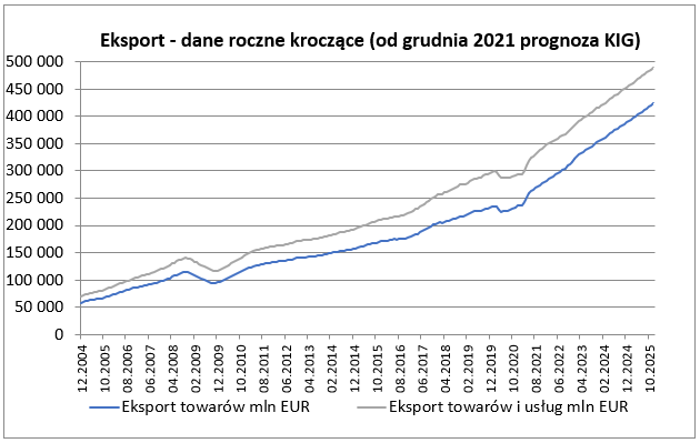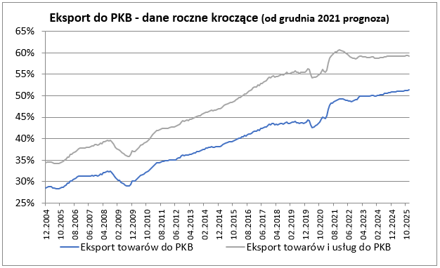 Eksport towarów wynosząc w listopadzie 26 915 mln EUR był wyższy od październikowego o 4,7%, okazał się też o 14,2% wyższy niż przed rokiem (w październiku roczna dynamika eksportu była na poziomie 9,7%). Poziom eksportu w listopadzie bieżącego roku był istotnie wyższy od średnio oczekiwanego przez rynek i nieco wyższy od oczekiwanego przez nas. Po listopadzie suma eksportu z ostatnich 12 miesięcy sięgnęła 277,2 mld EUR co stanowiło odpowiednik 49,2% PKB. Import towarów w listopadzie w kwocie 27 547 mln EUR był o 6,3% wyższy od notowanego w październiku i równocześnie o 29,0% wyższy niż przed rokiem (w październiku roczna dynamika importu była na poziomie 20,9%). Wyniki importu również okazały się wyraźnie wyższe niż w prognozach.