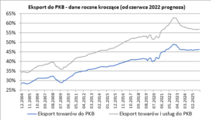 Eksport towarów wynosząc w maju 28 221 mln EUR był wyższy od kwietniowego o 6,9%, okazał się też o 3,3% wyższy niż przed rokiem (w kwietniu roczna dynamika eksportu była na poziomie 2,6%). Poziom eksportu w maju był nieco wyższy od oczekiwanego przez rynek i przez nas. Po maju suma eksportu z ostatnich 12 miesięcy sięgnęła 333,9 mld EUR co stanowiło odpowiednik 47,8% PKB. Import towarów w maju w kwocie 27 110 mln EUR był o 3,9% wyższy od notowanego w kwietniu i równocześnie o 6,2% niższy niż przed rokiem (w kwietniu roczna dynamika importu była ujemna na poziomie -8,9%). Wyniki importu okazały się słabsze od prognozowanych przez rynek i przez nas.