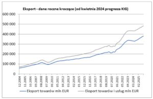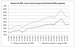Eksport towarów wynosząc w marcu 28 331 mln EUR był wyższy od lutowego o 4,2%, okazał się równocześnie o 9,5% niższy niż przed rokiem (w lutym roczna dynamika eksportu była dodatnia – na poziomie 0,5%). Wyniki marcowe były zbliżone do oczekiwanych przez nas i słabsze od średniej z oczekiwań rynkowych. Po marcu suma eksportu z ostatnich 12 miesięcy wyniosła 330 mld EUR co stanowiło odpowiednik 42,6% PKB. Import towarów w marcu w kwocie 27 845 mln EUR był o 3,7% wyższy od notowanego w lutym i równocześnie o 8,3% niższy niż przed rokiem (w lutym roczna dynamika importu była dodatnia na poziomie 0,9%). Import był wyraźnie niższy od oczekiwanego przez rynek i przez nas.
