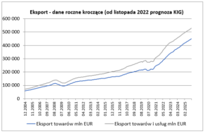 • Po październiku suma eksportu z ostatnich 12 miesięcy sięgnęła 310,8 mld EUR co stanowiło odpowiednik 48,5% PKB.