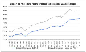Na wyniki eksportu mniej już wpływają efekty napaści Rosji na Ukrainę – patrz wstrzymanie wysyłek towarów na wschód i perturbacje w łańcuchach dostaw.