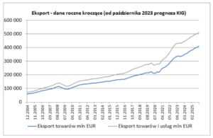 Saldo obrotów bieżących w ujęciu rocznym kroczącym po wrześniu okazało się dodatnie i wyniosło 4 605 mln EUR, co stanowiło odpowiednik 0,63% PKB Polski. Po sierpniu saldo obrotów bieżących było dodanie i wyniosło 1 834 mln EUR, tj. 0,26% PKB Polski. Widać więc w tym zakresie znaczącą (i kolejną z rzędu) poprawę. Jeszcze we wrześniu 2022 ujemne saldo wyniosło -18 610 mln EUR co było odpowiednikiem aż -2,93% PKB.