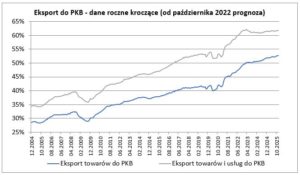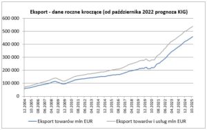 Eksport towarów wynosząc we wrześniu 28 498 mln EUR był wyższy od sierpniowego o 11,4%, okazał się też o 25,5% wyższy niż przed rokiem (w sierpniu roczna dynamika eksportu była na poziomie 26,7%). Poziom eksportu we wrześniu był istotnie wyższy od średnio oczekiwanego przez rynek, równocześnie nieco wyższy od naszej prognozy. Na wyniki eksportu mniej już wpływają efekty napaści Rosji na Ukrainę – patrz wstrzymanie wysyłek towarów na wschód i perturbacje w łańcuchach dostaw. Po wrześniu suma eksportu z ostatnich 12 miesięcy sięgnęła 305,3 mld EUR co stanowiło odpowiednik 48,3% PKB. Import towarów we wrześniu w kwocie 30 552 mln EUR był o 5,5% wyższy od notowanego w sierpniu i równocześnie o 28,9% wyższy niż przed rokiem (w sierpniu roczna dynamika importu była na poziomie 28,7%). Wyniki importu okazały się istotnie wyższe do prognozowanych średnio przez rynek i nieco wyższe od naszej prognozy. Trzeba pamiętać, iż wyniki importu wciąż mocno podbijane były wysokimi cenami surowców.