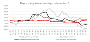Tak wyraźny wzrost poziomu depozytów w tej grupie klientów banków w lipcu nie jest typowy. Obserwowane są często wzrosty, ale mniejszych rozmiarów. W dodatku w tym roku dane dotyczące przemysłu, budownictwa i handlu detalicznego nie wskazywały na to, że miesięczny wzrost depozytów firm (patrz zrealizowane utargi i związany z nimi osad na rachunkach) może być tak duży, ani na to, że wciąż mocno rosła będzie roczna dynamika depozytów. Przy jednocześnie postępującym spadku inflacji można postawić tezę, że w przeciwieństwie do praktyki kilku ostatnich kwartałów depozyty firm są odnawiane w tempie wystarczającym do utrzymania rozsądnego poziomu płynności, a nawet w tym zakresie odrabiane są wcześniejsze zaległości.