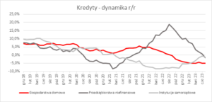 Kredyty w tej grupie klientów w lipcu zazwyczaj nie zmieniają się istotnie. Tegoroczna zmiana może wiec uchodzić za normalną. Wciąż jednak jesteśmy w obserwowanej w niemal całym roku 2022 oraz początku roku 2023 serii korekt poziomu kredytów. Kolejny miesiąc z rzędu utrzymuje się też ujemna roczna dynamika kredytów. Jest to efekt spadku zainteresowania kredytami (zwłaszcza hipotecznymi) oraz szybszej spłaty zaciągniętych wcześniej zobowiązań. To oczywiście skutek zaostrzania polityki monetarnej – wzrostu stóp procentowych. Ujemnej dynamice poziomu kredytów sprzyja też mocna wycena złotego. Przeliczane bowiem na złotego kredyty walutowe okazują się mniejsze niż przed rokiem.