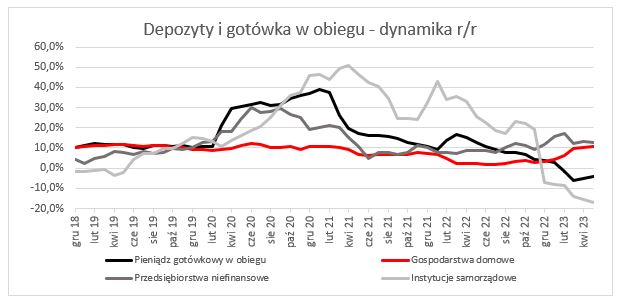 Spadek tych depozytów w maju jest asezonowy. Zazwyczaj obserwowany był tu wzrost rzędu kilku miliardów złotych. Tegoroczny majowy spadek poziomu środków był najprawdopodobniej związany z równoczesnym spadkiem przychodów i wzrostem wydatków (w tym na energię i jej nośniki).