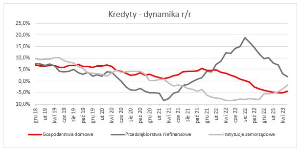 Kredyty w tej grupie klientów w maju zazwyczaj rosną (choć nie zawsze). Tegoroczny spadek można wiec uznać za anormalny. To kontynuacja obserwowanej w niemal całym roku 2022 oraz początku roku 2023 serii korekt poziomu kredytów. Kolejny miesiąc z rzędu utrzymuje się też ujemna roczna dynamika kredytów. Jest to efekt spadku zainteresowania kredytami (zwłaszcza hipotecznymi) oraz szybszej spłaty zaciągniętych wcześniej zobowiązań. To oczywiście skutek zaostrzania polityki monetarnej – wzrostu stóp procentowych.