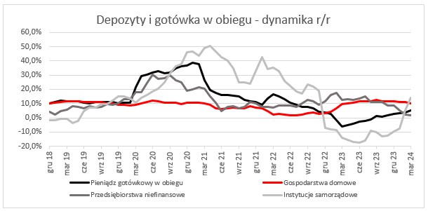 Narodowy Bank Polski zaprezentował dane o podaży pieniądza w końcu marca 2024. Z punktu widzenia obserwacji procesów w gospodarce realnej szczególnie istotne są w nich dane o zmianach poziomów depozytów i kredytów gospodarstw domowych, przedsiębiorstw i samorządów oraz wielkości gotówki w obiegu. Wyniki marca powinny być traktowane jako ważne, widać w nich bowiem rozwinięcie reakcji na zmiany w otoczeniu gospodarki w tym niedawne zmiany stóp procentowych, reakcję na agresję Rosji na Ukrainę, wejście w okres zmiany koniunktury.