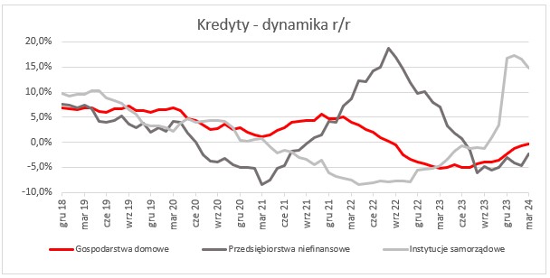Zazwyczaj przyjmuje się, że kredyty w tej grupie klientów w marcu rosną (reagując na większe wydatki tak świąteczne jak i te związane z wchodzeniem do sprzedaży kolekcji wiosna – lato). Tak jednak nie było w dosyć specyficznych ostatnich latach. Obserwowany tym razem spadek może oznaczać wciąż niską skłonność ludności do korzystania z kredytów (w otoczeniu wysokich stóp i przy słabej koniunkturze). Wypada pamiętać, że kolejny miesiąc z rzędu utrzymuje się ujemna roczna dynamika kredytów.
