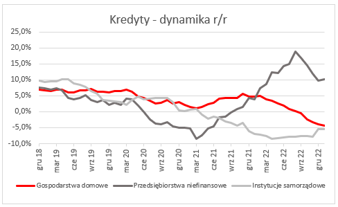 Kredyty w tej grupie klientów w styczniu zazwyczaj z przyczyn sezonowych są stabilne bądź nieznacznie rosną – po wysokim ich poziomie w grudniu. Tegoroczny wyraźny spadek można wiec uznać za anormalny. To kontynuacja obserwowanej w niemal całym roku 2022 serii korekt poziomu kredytów, przerwanej jedynie chwilowo i minimalnie w czerwcu i wrześniu. Systematyczne postępuje też silne zmniejszanie rocznej dynamiki akcji kredytowej (i to do wyraźnie ujemnych poziomów). Jest to efekt spadku zainteresowania kredytami (zwłaszcza hipotecznymi) oraz szybszej spłaty zaciągniętych wcześniej zobowiązań. To oczywiście skutek zaostrzania polityki monetarnej – wzrostu stóp procentowych. Spadek akcji kredytowej w ujęciu miesięcznym w styczniu przyspieszany był wzmocnieniem złotego wobec dolara i franka, (wycena w złotych kredytów walutowych spadała). Efekt kursowy odwrotnie działał w przypadku dynamiki rocznej (złoty był słabszy niż rok temu o 2,4% wobec euro oraz 5,7% wobec dolara i 6,3% wobec franka). A mimo to dynamika roczna kredytów była ujemna.