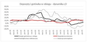 W styczniu zmniejszył się poziom gotówki w obiegu – o 3,27 mld PLN tj. 0,90% do kwoty 359,34 mld PLN. Jednocześnie okazał się on o 10,95 mld PLN i 3,1% wyższy niż przed rokiem (w grudniu był wyższy niż przed rokiem o 2,5%). Po styczniu zazwyczaj oczekuje się niewielkiego spadku poziomu gotówki w obiegu. W ostatnich miesiącach wyraźnie spada udział gotówki w podaży pieniądza. Jest to oczekiwane. W okresie wysokich stóp procentowych – naturalne preferowanie płynności – staje się zbyt kosztowne.