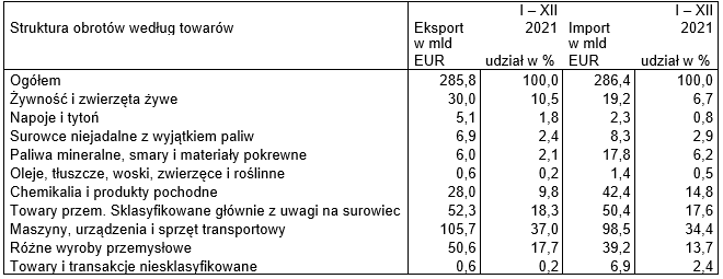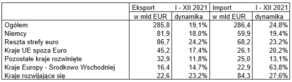 Według informacji zawartych w raporcie, eksport ogółem w okresie I – XII 2021 wyniósł 285,8 mld EUR, co stanowiło wartość o 19,1% wyższą, niż w analogicznym okresie roku ubiegłego.