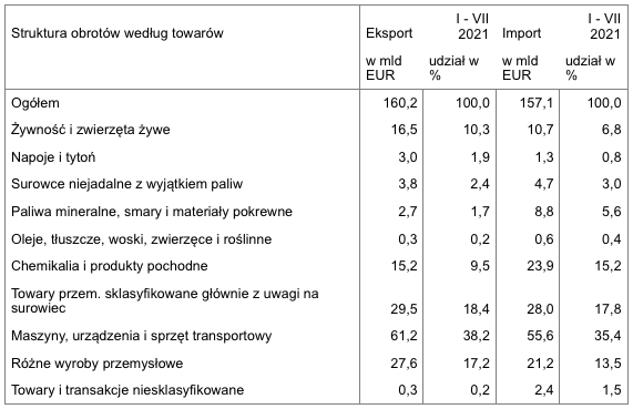 Według informacji zawartych w raporcie, eksport ogółem w okresie I – VII 2021 wyniósł 160,2 mld EUR, co stanowiło wartość o 21,9% wyższą, niż w analogicznym okresie roku ubiegłego. Wypada przypomnieć, że wyniki eksportu w okresie styczeń – czerwiec 2021 były o 22,9% wyższe niż w analogicznym okresie roku ubiegłego.