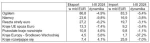 Według informacji zawartych w raporcie, eksport ogółem w pierwszych trzech miesiącach 2024 roku wyniósł 86,8 mld EUR, co stanowiło wartość o 4,9% niższą niż w analogicznym okresie roku ubiegłego. Dane te okazały się nieco wyższe od oczekiwanych. W okresie I – II 2024 roku eksport był niższy niż przed rokiem o 3,2%.