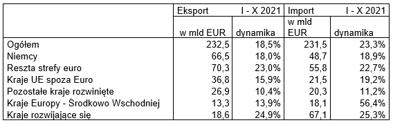 Stopniowo normalizują się  kontakty z krajami wysokorozwiniętymi spoza UE (26,9 mld EUR poziom wyższy niż przed rokiem o 10,4%) np. do Wielkiej Brytanii (11,9 mld EUR wzrost o 6,4%) i do USA (6,2 mld EUR wzrost o 9,0%). Do krajów Europy Środkowo-Wschodniej wyeksportowano w pierwszych dziesięciu miesiącach roku 2021 towary na kwotę 13,3 mld EUR (wzrost o 13,9%), głównie do Rosji (6,5 mld EUR wzrost o 11,5%). Do krajów rozwijających się również odnotowano doskonałe wyniki – eksport na poziomie – 18,6 mld EUR – wyraźnie wyższy niż przed rokiem (o 24,9%).