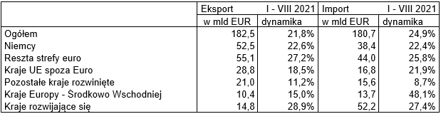 15.10.2021Eksport ogółem w okresie I – VIII 2021 wyniósł 182,5 mld EUR a import 180,7 mld EUR