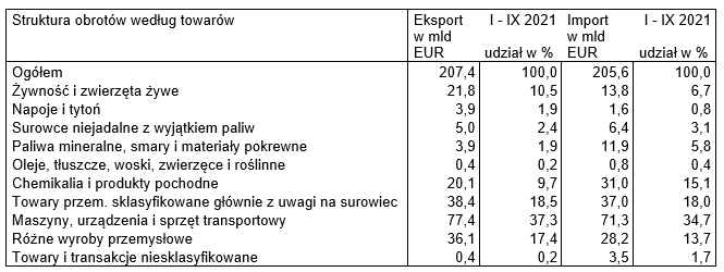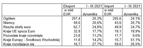 Według informacji zawartych w raporcie, eksport ogółem w okresie I – IX 2021 wyniósł 207,4 mld EUR, co stanowiło wartość o 20,3% wyższą, niż w analogicznym okresie roku ubiegłego.