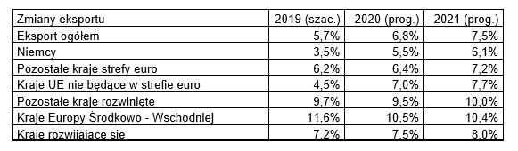Polski eksport w roku 2019 najprawdopodobniej zamknął się kwotą 229,2 mld EUR wyższą o 5,7% niż w roku 2018. Zgodnie z aktualnymi założeniami co do stanu światowej i polskiej gospodarki w latach 2020 – 2021 można oczekiwać zwiększenia naszej sprzedaży z 229,2 mld EUR w roku 2019 do odpowiednio 244,8 mld EUR (o 6,8%) w roku 2020 oraz do 263,1 mld EUR (o 7,5%) w roku 2021.