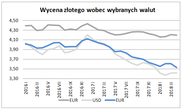 Główną walutą rozliczeniową dla polskiego eksportu pozostaje euro. W kwietniu złoty wzmocnił się do euro o 0,4% do 4,1948 i okazał się równocześnie o 1,0% mocniejszy niż przed rokiem. Wzmocnienie kwietniowe należy określić typowym (kwiecień przynosi niewielkie wzmocnienie stanowiące korektę po obserwowanych zazwyczaj w trzecim miesiącu roku spadku). Sytuacja finansowa eksporterów ze względu na kurs nie uległa jednak istotnej zmianie. Wzmocnienie wyceny złotego w stosunku do notowanej przed rokiem należy określić jako niewielkie. Eksporterzy rozliczający sprzedaż w dolarach mieli trudniejszą sytuację. Choć w kwietniu złoty osłabił się w stosunku do dolara – o 0,1% do 3,4188 to jednocześnie okazał się 13,6% mocniejszy niż przed dwunastoma miesiącami.