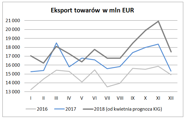 Według Narodowego Banku Polskiego w pierwszych trzech miesiącach bieżącego roku eksport wyniósł 51 402 mln EUR i okazał się o 4,6% większy niż w analogicznym okresie roku ubiegłego. Według sprawozdawczości prezentowanej przez Główny Urząd Statystyczny eksport wynosząc w okresie I – III 2018 r. 52 500 mln EUR okazał się wyższy niż przed dwunastoma miesiącami o 3,7%.