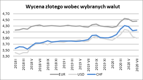 o 4,2%). Zmiany te nieco poprawiły pozycję konkurencyjną naszych eksporterów. Słabiej prezentowała się natomiast sytuacja eksporterów rozliczających sprzedaż w dolarach. W lipcu złoty wzmocnił się w stosunku do tej waluty – o 1,3% do 3,8943. Jednocześnie okazał się słabszy niż przed rokiem o 2,6% (w czerwcu złoty był słabszy niż przed rokiem o 4,3%).