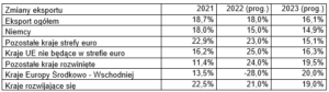 Perspektywy roku 2022 w zakresie możliwego do wypracowani eksportu do niedawna prezentowały się bardzo dobrze. Wysokie okazało się otwarcie roku. Ponadto bardzo dobrze prezentowała się (i mimo postępującej korekty, wciąż prezentuje) dynamika zamówień w przemyśle – w tym zwłaszcza zamówień eksportowych. Powinno to umożliwić utrzymanie podwyższonej dynamik eksportu przynajmniej w kilku najbliższych miesiącach. Nie ulega jednak wątpliwości, że atak Rosji na Ukrainę mocno wpływa na procesy gospodarcze w tym na wielkość sprzedaży eksportowej. W pierwszej kolejności bardzo głębokiej redukcji (przynajmniej czasowej) ulega sprzedaż na trzy ważne dla nas rynki (Ukraina, Białoruś, Rosja). Widoczne są już też perturbacje związane z zaburzeniami w łańcuchach dostaw. Część z zamówień eksportowych może nie być zrealizowana w związku z brakami materiałów czy komponentów. Część zamówień zostanie odwołanych – bo odbiorcami są firmy istotnie eksportujące na rynki wschodnie.