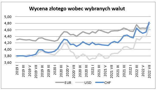 W lipcu wycena złotego wobec euro uległa wyraźnemu osłabieniu w stosunku do notowanej w czerwcu – o 2,7% i wyniosła 4,7712. Równocześnie okazała się o 4,6% słabsza niż przed rokiem (w czerwcu złoty był słabszy niż przed rokiem o 3,2%).