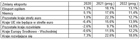Według ostatecznych danych w roku 2020 nasza sprzedaż eksportowa uległa zwiększeniu z 232,9 mld EUR w roku 2019 do 236,0 mld EUR (o 1,3%). Wypada przypomnieć, że w danych wstępnych wskazywany był minimalny spadek eksportu. Faktyczny wzrost, choć niewielki, ale osiągnięty w tak trudny dla światowej gospodarki czas – należy uznać za wynik wręcz nadzwyczajny. W roku 2021 eksport wynosząc prawdopodobnie 278,8 mld EUR mógł okazać się o 18,1% wyższy niż w roku 2020, a w roku 2022 wynosząc 315,3 mld EUR zwiększyć się o dalsze 13,1%.
