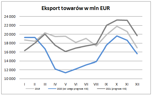 Zgodnie z aktualnymi założeniami co do stanu światowej i polskiej gospodarki w latach 2020 – 2021 można oczekiwać zmniejszenia naszej sprzedaży z 230, 3 mld EUR w roku 2019 do 189, 5 mld EUR (o 17, 7%) w roku 2020 oraz zwiększenia jej do 228, 0 mld EUR (o 20, 3%) w roku 2021. Poziom eksportu z roku 2019 uda się przekroczyć najprawdopodobniej dopiero w roku 2022.