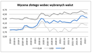 W lutym wycena złotego wobec euro okazała się bardzo zbliżona do notowanej w styczniu i wyniosła 4,5539. Równocześnie okazała się o 1,2% słabsza niż przed rokiem (w styczniu złoty był słabszy niż przed rokiem o 0,2%). Wycena złotego pozostawała więc słaba.