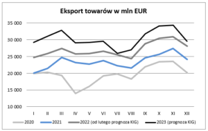 Dostępne obecnie dane o stanie gospodarki realnej oraz opinie pozyskane od członków KIG, pozwalają szacować, że eksport w lutym 2022 roku wyniósł
