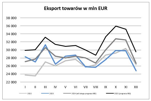 Eksperci KIG szacują, że eksport w roku 2024 może zwiększyć się do 347,0 mld EUR tj. o 3,9%, a w roku 2025 wynosząc 378,9 mld EUR może być wyższy niż rok wcześniej o 9,2%