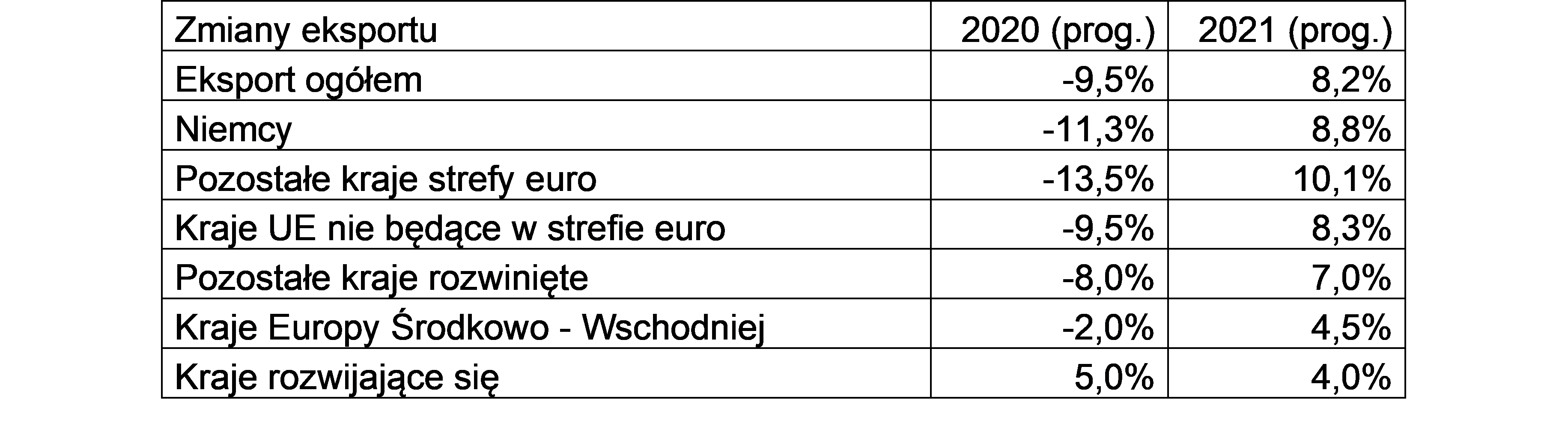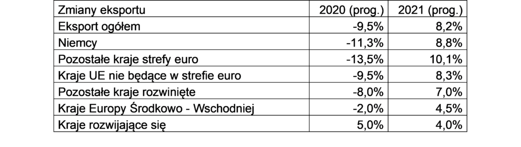 W roku 2020 można oczekiwać zmniejszenia naszej sprzedaży eksportowej z 230,3 mld EUR w roku 2019 do 208,4 mld EUR (o 9,5%). Regres, choć bardzo dotkliwy, może okazać się jednak wyraźnie mniejszy od szacowanego przed dwoma miesiącami (spadek do 189,0 mld EUR tj. o 18,0%). W roku 2021 eksport wynosząc 224,6 mld EUR może okazać się o 8,2% wyższy niż w roku 2020.