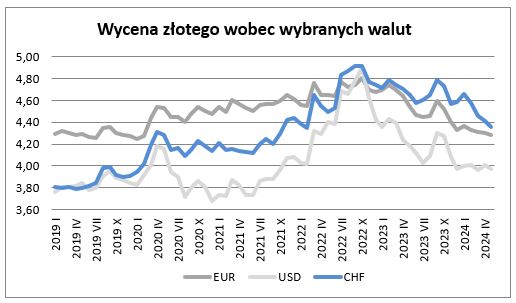 W maju wycena złotego wobec euro uległa wzmocnieniu w stosunku do notowanej w kwietniu – o 0,41% i wyniosła 4,2848. Równocześnie okazała się o 5,6% mocniejsza niż przed rokiem (w kwietniu złoty był mocniejszy niż przed rokiem o 7,3%).