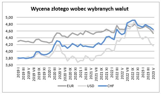 W maju wycena złotego wobec euro uległa wzmocnieniu w stosunku do notowanej w kwietniu – o 2,16 % i wyniosła 4,5411. Równocześnie okazała się o 2,3% mocniejsza niż przed rokiem (w kwietniu złoty był mocniejszy niż przed rokiem o 0,1%).