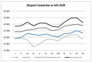 - Według naszych szacunków eksport roku 2022 wynosząc 321,8 mld EUR może okazać się o 22,1% wyższy niż w roku 2021, a w roku 2023 wynosząc 367,7 mld EUR zwiększyć się o dalsze 14,3%.