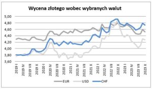 W październiku wycena złotego wobec euro uległa wzmocnieniu w stosunku do notowanej we wrześniu – o 1,64% i wyniosła 4,5186. Równocześnie okazała się o 6,0% mocniejsza niż przed rokiem (we wrześniu złoty był mocniejszy niż przed rokiem o 3,1%).