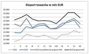 Dostępne obecnie dane o stanie gospodarki realnej oraz opinie pozyskane od członków KIG pozwalają szacować, że eksport w październiku 2023 roku wyniósł 30 016 mln EUR. Zwiększył się więc w stosunku do wartości notowanych we wrześniu o 9,1%, w stosunku zaś do wielkości notowanych przed dwunastoma miesiącami, zwiększył się o 2,7%. Wielkość eksportu w listopadzie, będzie ze względów sezonowych nieco wyższa od notowanej w październiku.