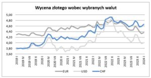 Większe zmiany w skali miesiąca obserwowano w przypadku notowań dolara. W styczniu złoty osłabił się w stosunku do tej waluty o 0,85% do 4,0011. Styczniowa wycena okazała się mocniejsza niż przed rokiem o 8,2%. W grudniu złoty wobec dolara był mocniejszy niż przed rokiem o 10,3%.