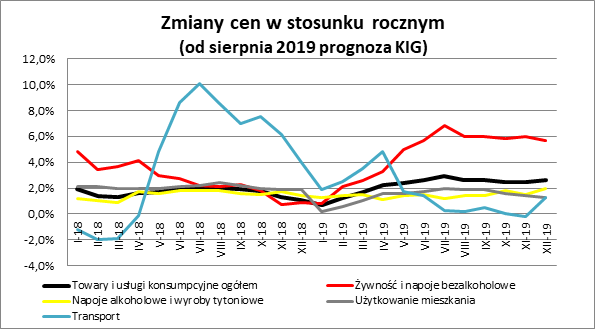 Oczekujemy, że w najbliższych miesiącach roczny wskaźnik inflacji może nieznacznie obniżyć się w stosunku do zanotowanego w lipcu – z minimum lokalnym na poziomie 2,5% w początku kwartału czwartego. Zakładamy, że w grudniu br. dwunastomiesięczny wskaźnik inflacji wynosić będzie 2,6%, średnioroczny zaś poziom wzrostu cen w roku 2019 wyniesie 2,2%, wobec 1,7% w roku 2018. Kolejną falę narastania inflacji może przynieść pierwszy kwartał roku 2020.
