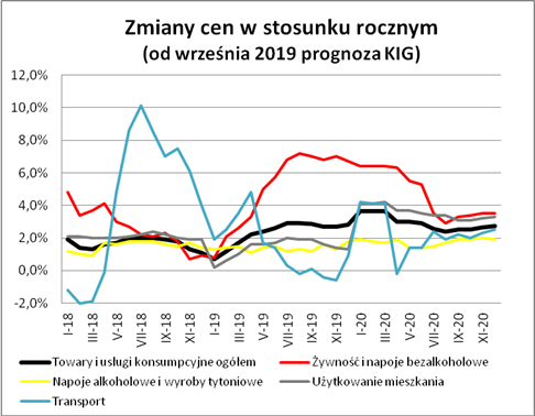 W skali miesiąca najbardziej widoczne były wzrosty cen w kategoriach: łączność (0,8%), restauracje i hotele (0,5%), transport (0,5%), użytkowanie mieszkania (0,2%), zdrowie (0,1%). Skalę inflacji spłycały natomiast spadki cen w grupach: odzież i obuwie (1,5%), żywność i napoje bezalkoholowe (0,3%), inne towary i usługi (0,2%), rekreacja i kultura (o 0,1%).