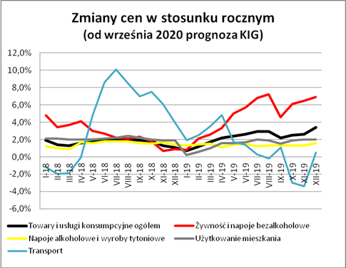 Kolejne miesiące roku powinny przynieść nieznaczny wzrost rocznego wskaźnika inflacji do około 3,3% − 3,4% a później wyraźniejszy jego spadek w grudniu do około 2,8%. Średnioroczny wskaźnik inflacji w roku 2020 wyniesie około 3,5% wobec 2,3% z roku 2019 i 1,7% z roku 2018. Czynnikami ryzyka są tu kurs walutowy (w sytuacji silnego osłabienia się złotego inflacja może wzrosnąć, umocnienie złotego zaś może zbijać inflację), sytuacja na rynkach surowców (obecnie inflację coraz słabiej zbijają niskie ceny paliw), ale również skala recesji spowodowanej wpływem na gospodarkę koronawirusa wraz z mogącymi nastąpić silnymi zmianami w strumieniach popytu tak konsumentów jak i klientów biznesowych oraz instytucjonalnych.