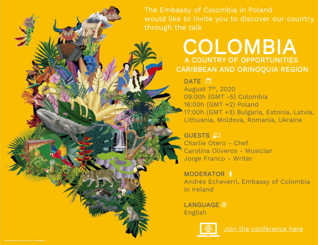 31.07.2020W imieniu Ambasady Kolumbii w Warszawie serdecznie zapraszamy na wydarzenie online, które odbędzie się 7 sierpnia 2020 r. Spotkanie będzie okazją do odkrycia regionów Kolumbii, Karaibów i Orinoquii. W spotkaniu można wziąć udział za pomocą oprogramowania Microsoft Teams lub bezpośrednio przez przeglądarkę internetową.