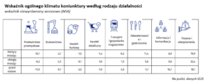 W stosunku do poprzedniego miesiąca wskaźnik ogólnego klimatu koniunktury w ujęciu miesięcznym (według danych niewyrównanych sezonowo) pogorszył się w 6 branżach a poprawił w 2. Największy spadek zanotowano w przetwórstwie przemysłowym – wskaźnik spadł z minus 6,2 w poprzednim miesiącu do minus 10,1. Z kolei największy wzrost widoczny jest w zakwaterowaniu i gastronomii (z 5,8 przed miesiącem do 11,4 obecnie).