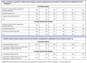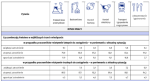 Główny Urząd Statystyczny przedstawił w czerwcu br. wyniki pogłębionych badań na temat przewidywań przedsiębiorców z 6 branż dotyczących zatrudnienia (rynek pracy). Większość firm w każdej z analizowanych branż deklaruje utrzymanie zatrudnienia na obecnym poziomie w najbliższych trzech miesiącach. W zależności od branży odsetek ten waha się od 79,0% do 91,0% w przypadku pracowników łatwych do zastąpienia i od 87,1% do 94,2% w przypadku trudnych do zastąpienia. Największy odsetek firm, które przewidują zwiększenie zatrudnienia reprezentuje – w przypadku pracowników łatwych do zastąpienia – przetwórstwo przemysłowe (9,1% ankietowanych), a w odniesieniu do pracowników trudnych do zastąpienia – budownictwo (7,6%). Z kolei wśród firm, które deklarują ograniczenie zatrudnienia, największy odsetek w przypadku pracowników łatwych do zastąpienia widoczny jest w przetwórstwie przemysłowym (11,9%); a pracowników trudnych do zastąpienia – w handlu detalicznym (7,0%).