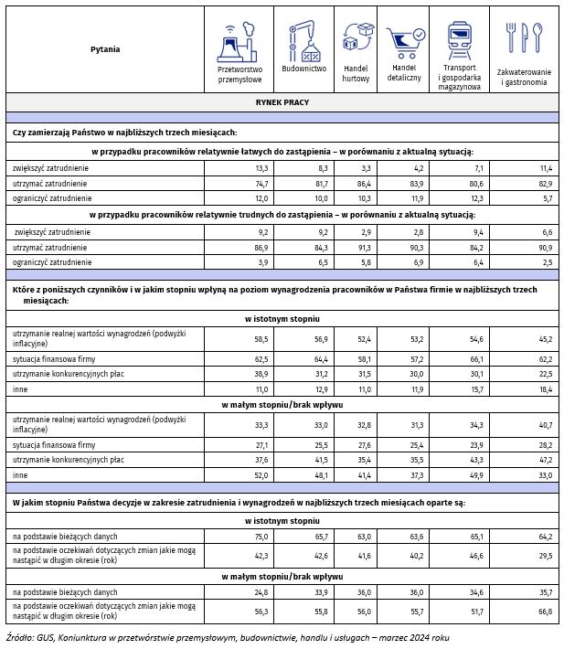 Główny Urząd Statystyczny przedstawił w marcu br. wyniki pogłębionych badań na temat przewidywań przedsiębiorców z 6 branż dotyczących zatrudnienia (rynek pracy). Większość firm w każdej z analizowanych branż deklaruje utrzymanie zatrudnienia na obecnym poziomie w najbliższych trzech miesiącach (odsetek od 74,7% do 86,4% w zależności od branży). Największy odsetek firm, które przewidują zwiększenie zatrudnienia reprezentuje – w przypadku pracowników łatwych do zastąpienia – przetwórstwo przemysłowe (13,3% ankietowanych), a w odniesieniu do pracowników trudnych do zastąpienia – transport i gospodarka magazynowa (9,4%). Z kolei wśród firm, które deklarują ograniczenie zatrudnienia, największy odsetek w przypadku pracowników łatwych do zastąpienia widoczny jest w branży transportu i gospodarki magazynowej (12,3%); a pracowników trudnych do zastąpienia – w handlu detalicznym (6,9%).