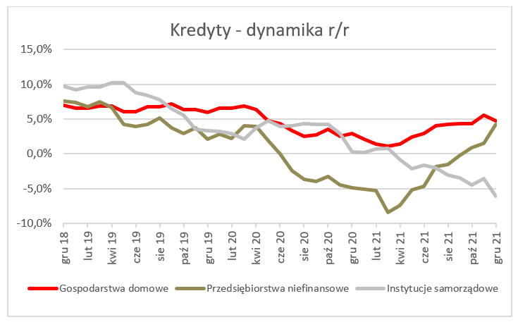 Przedsiębiorstwa niefinansowe w końcu grudnia zasilane były kredytami na poziomie 362,92 mld PLN. Było to o 0,16 mld i 0,04% więcej niż miesiąc wcześniej oraz o 14,82 mld PLN tj. 4,3% więcej niż przed rokiem. To już trzeci z rzędu miesiąc kiedy kredyty dla przedsiębiorstw okazywały się wyższe niż przed rokiem. Wcześniej przez bardzo dług czas (piętnaście miesięcy) kredyty dla firm były wciąż i wciąż niższe niż w analogicznym okresie roku ubiegłego. Jeszcze we wrześniu roczna dynamika kredytów była ujemna i wynosiła -0,2%. Jednocześnie firmy dysponowały kwotą 17,09 mld pozyskaną w postaci obligacji. Była ona o 0,24 mld PLN tj. 1,4% niższa niż przed miesiącem oraz o 0,56 mld PLN tj. o 3,4% wyższa niż przed rokiem. W listopadzie roczna dynamika środków pozyskanych w postaci obligacji wynosiła 3,7%.